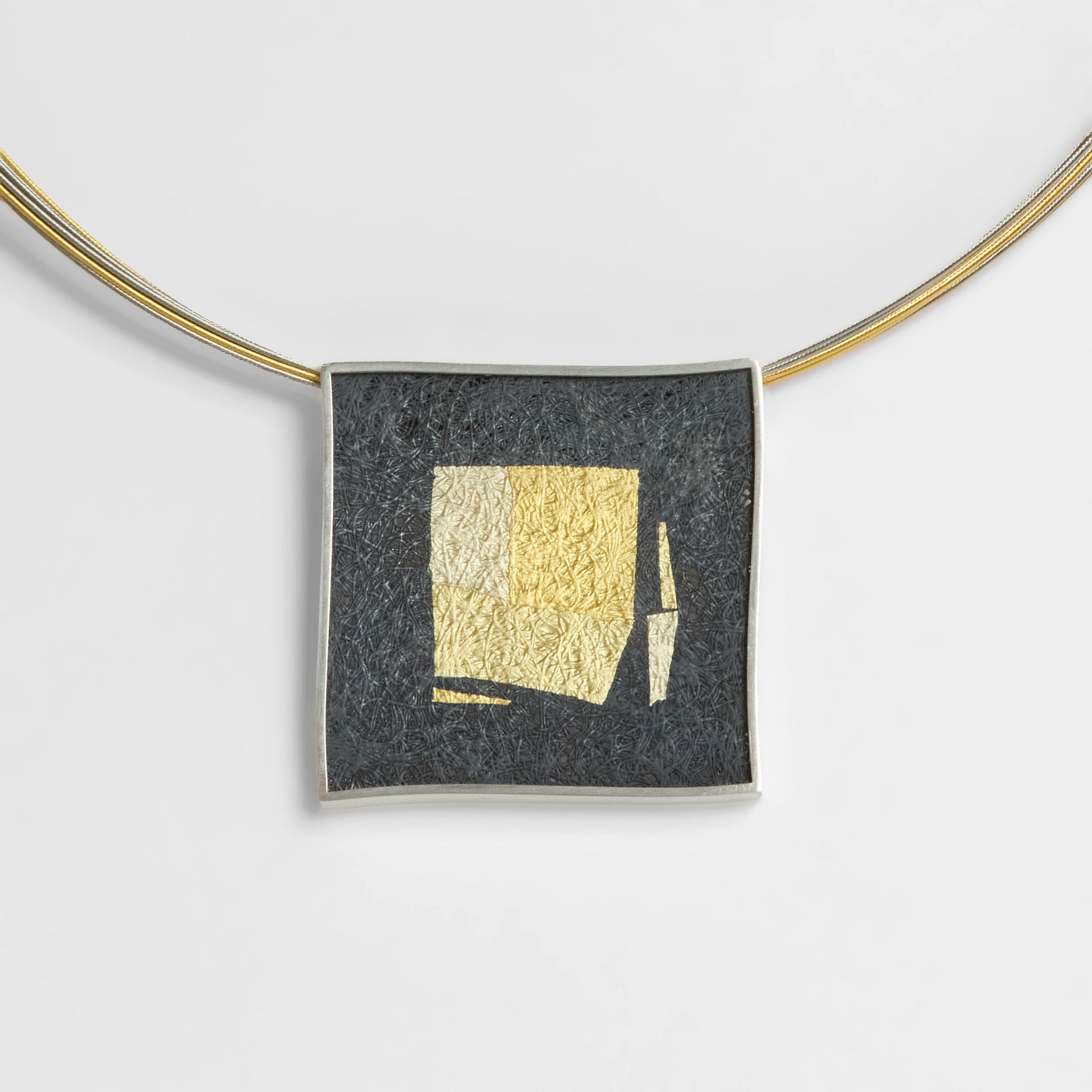 The main surface is made up of oxidised fine silver wire work with 24ct. and 18ct. gold abstract blocks fused to the surface.