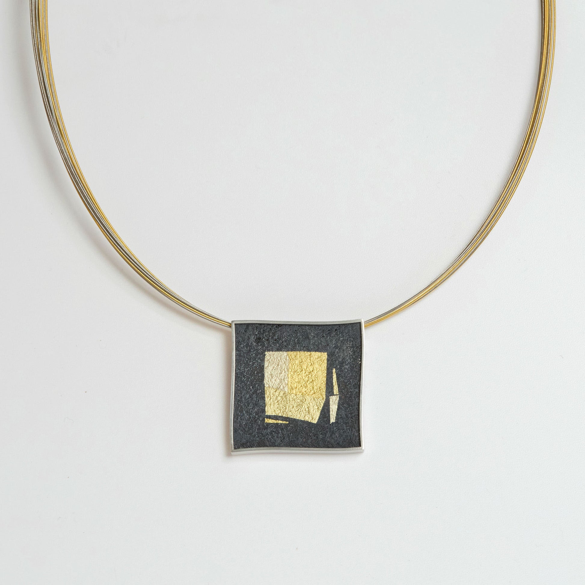 The frame is sterling silver and the pendant is presented on a 12 strand neckwire made up of stainless steel and gold plated stainless steel.