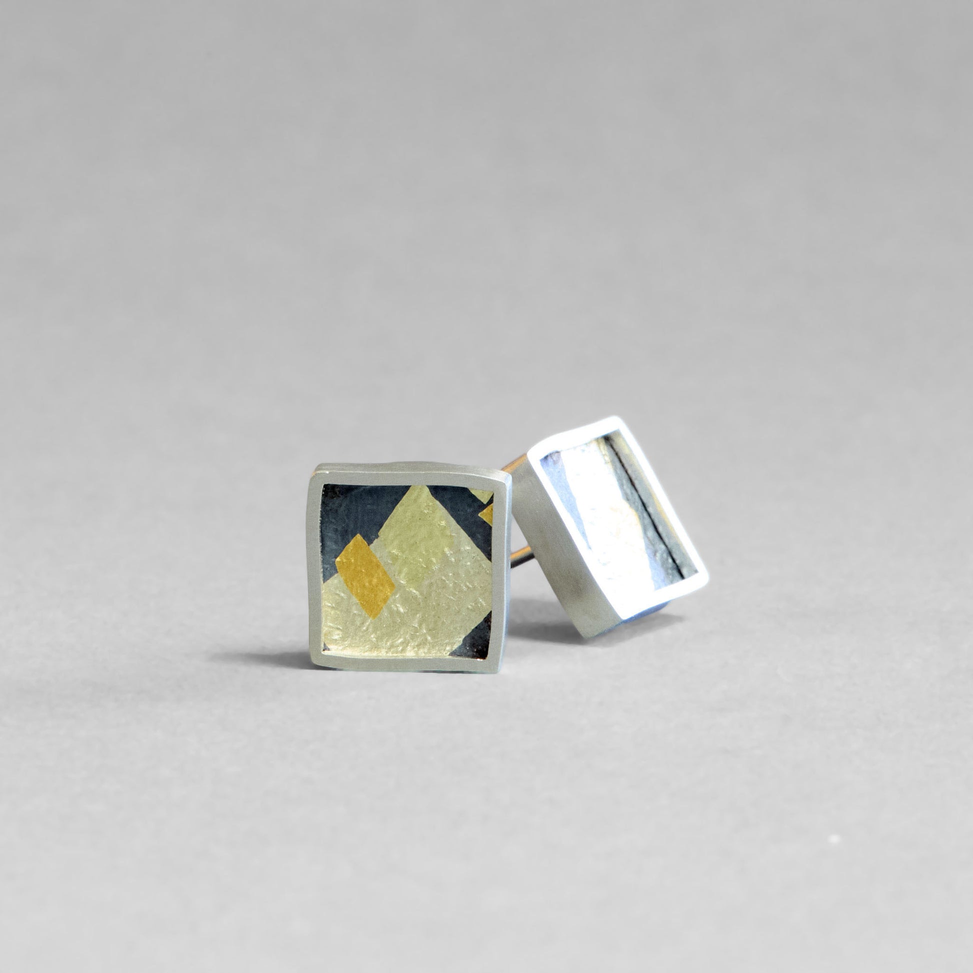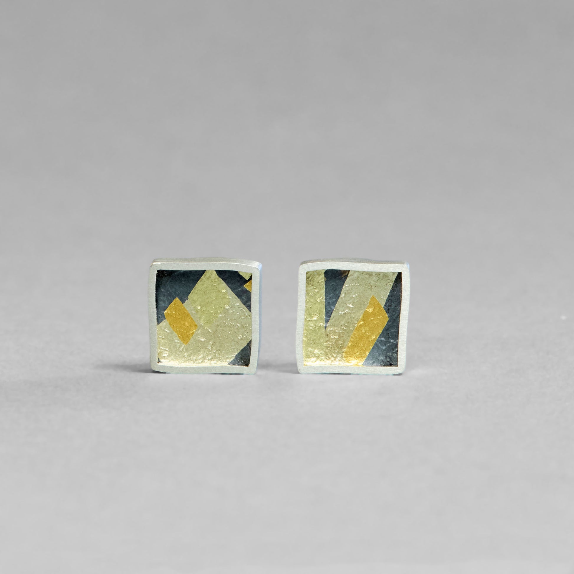 Main body of earring is oxidised fine silver wire with colour blocks in 3 shades of gold