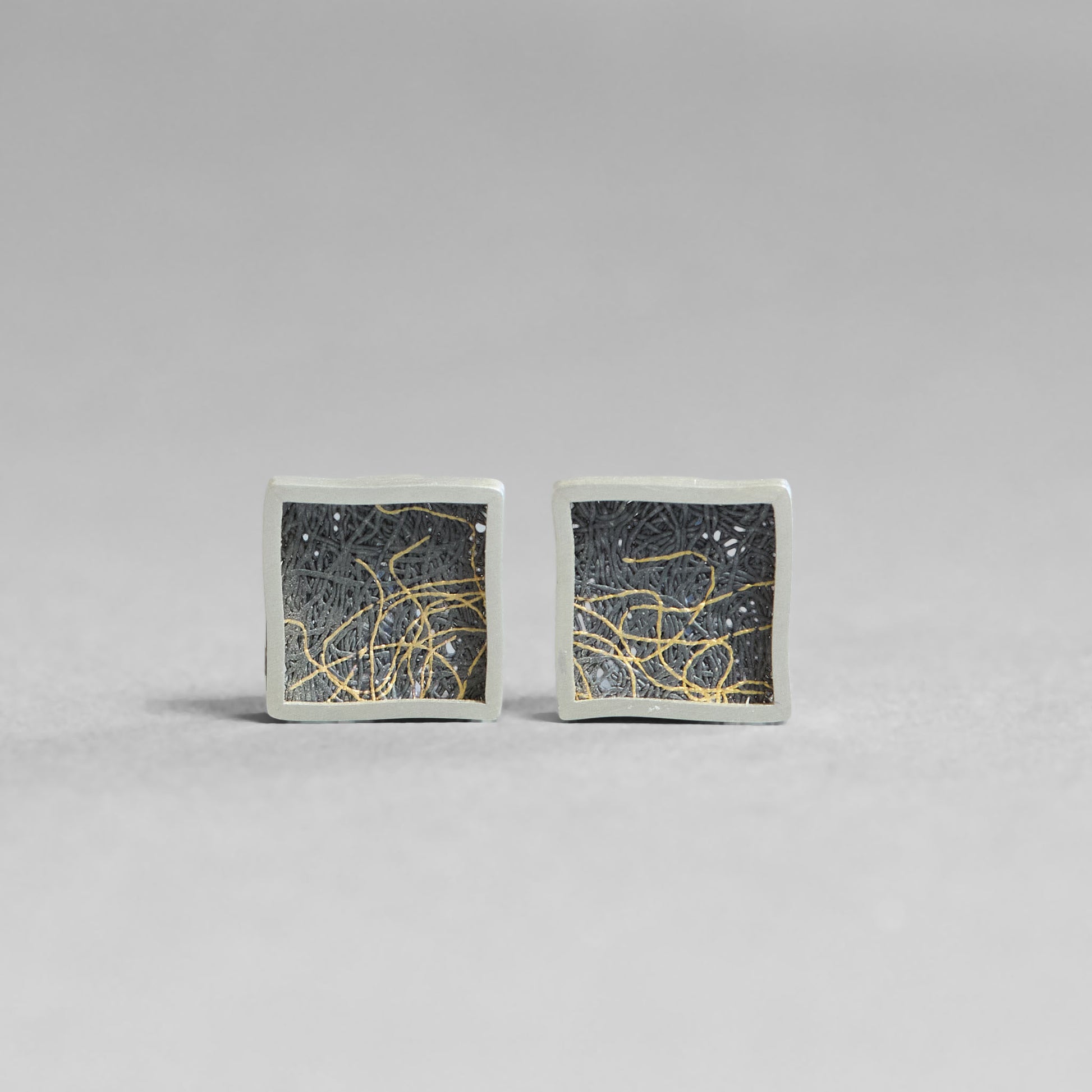 Main body of earring is oxidised fine silver wire with meandering gold wire detail.