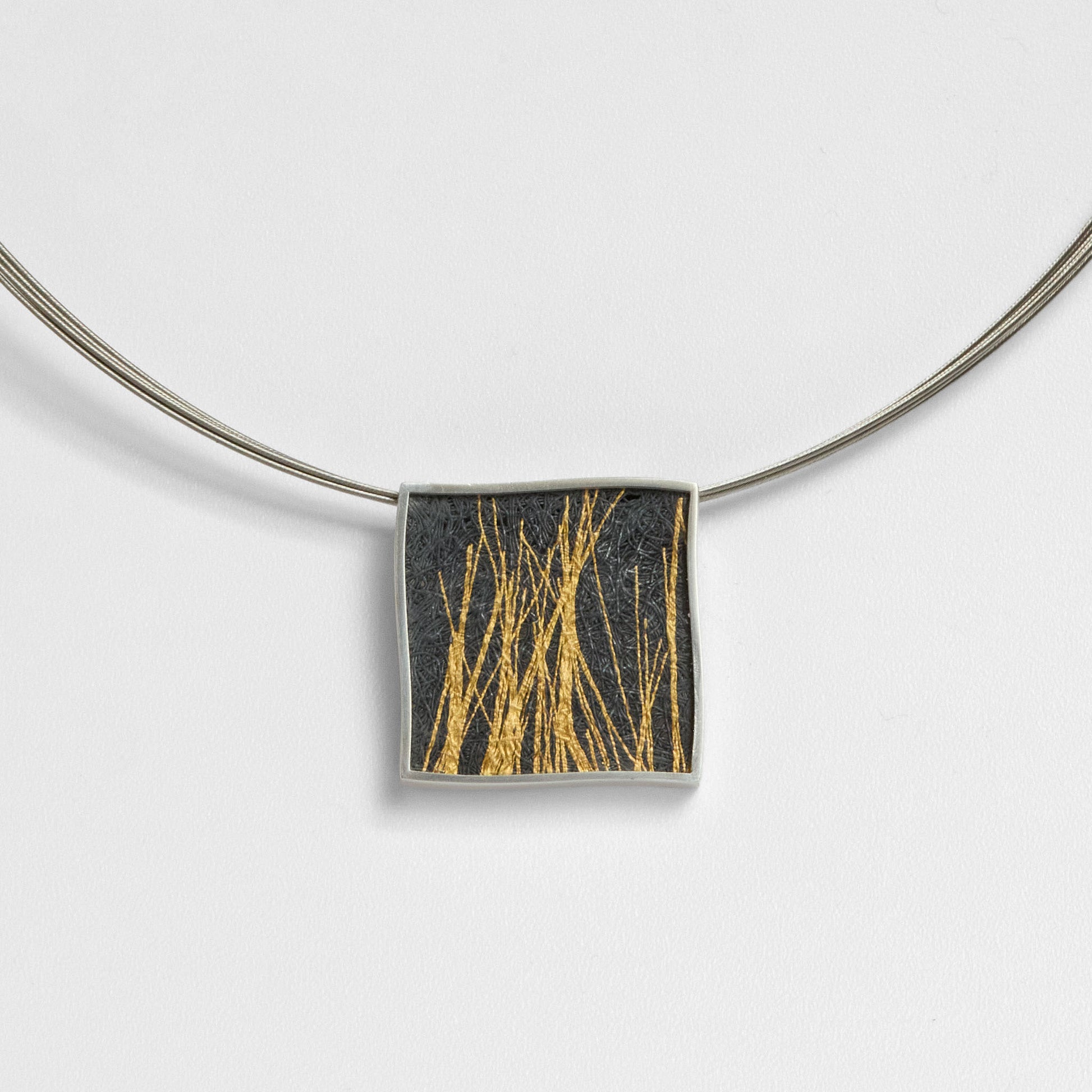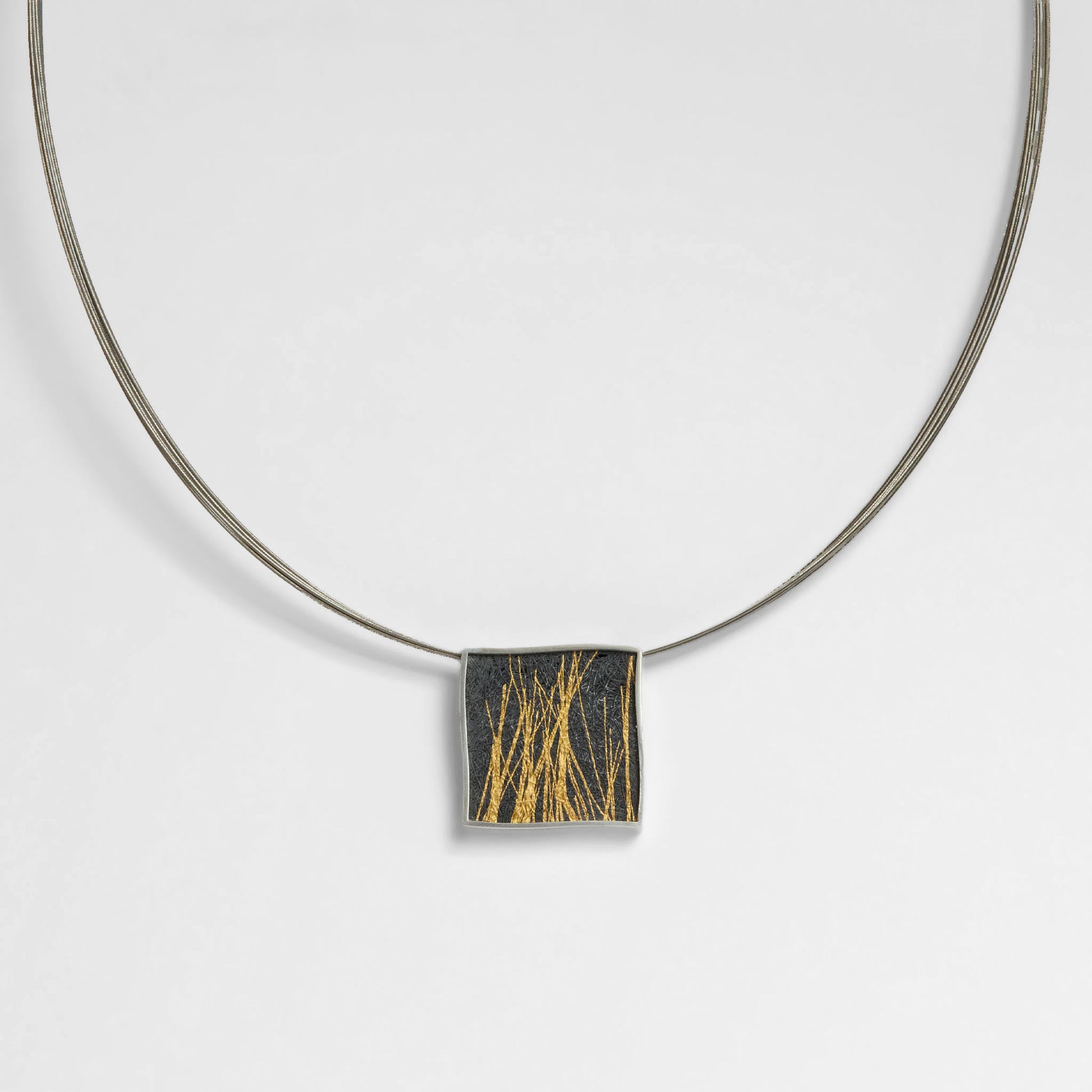 Main body of pendant is oxidised fine silver wire with 24ct. gold wires places vertically.