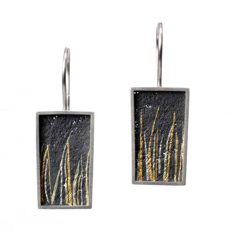 Main body of earring is oxidised fine silver wire with 24ct and 18ct. coloured gold strands